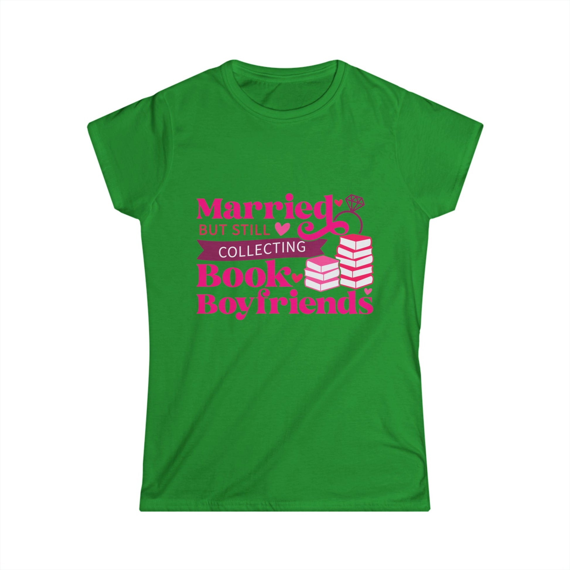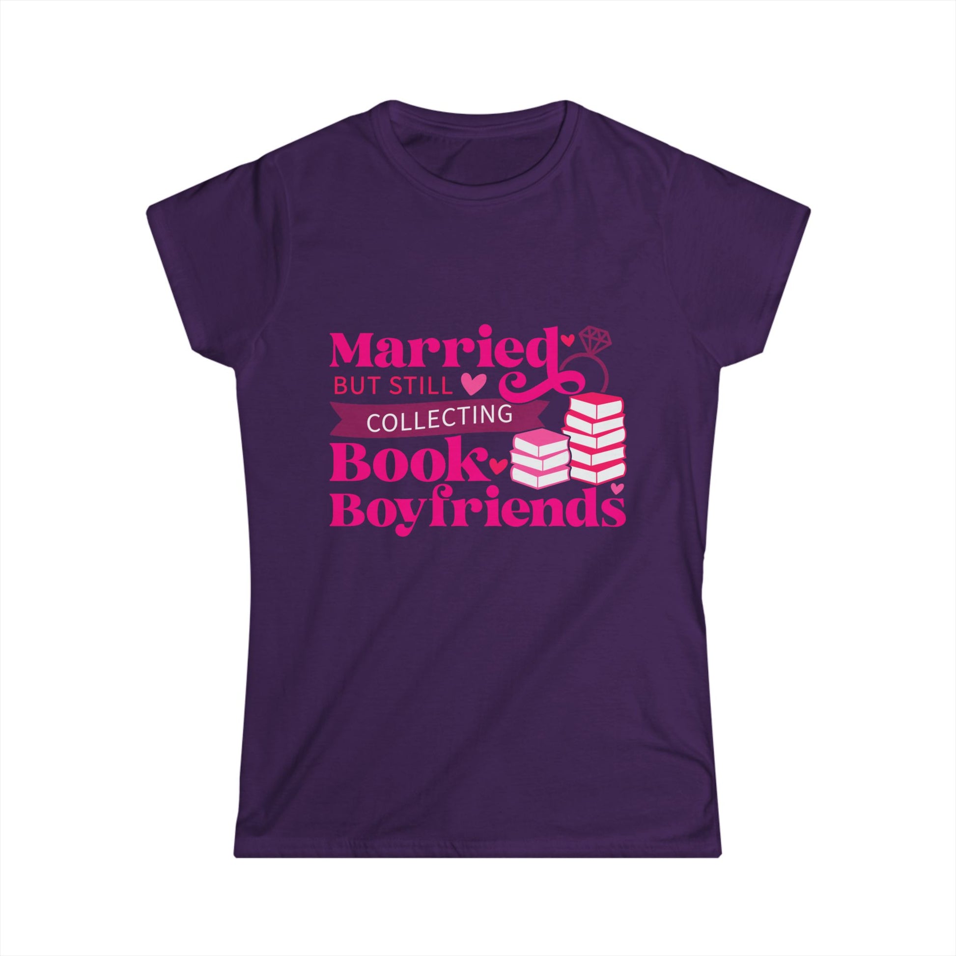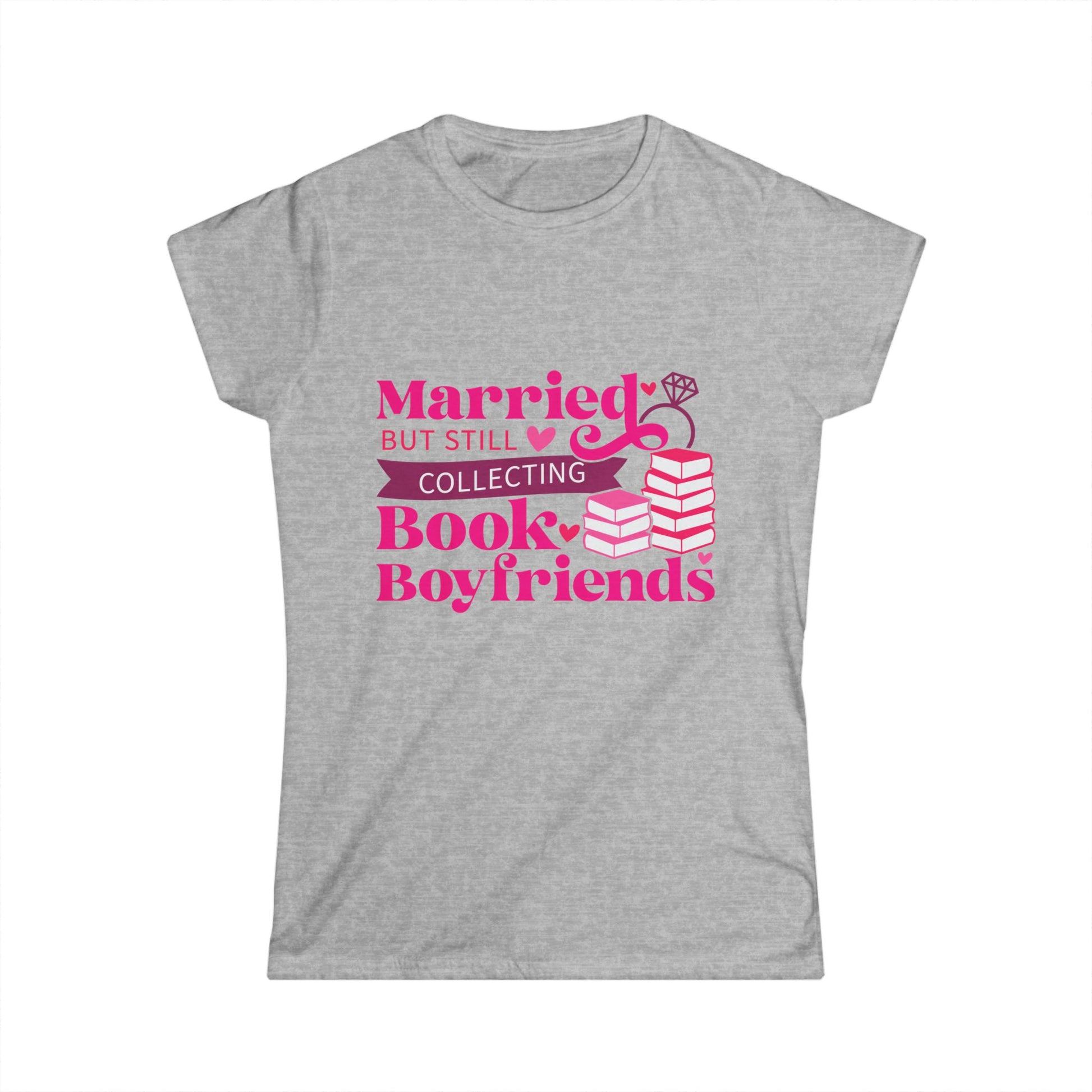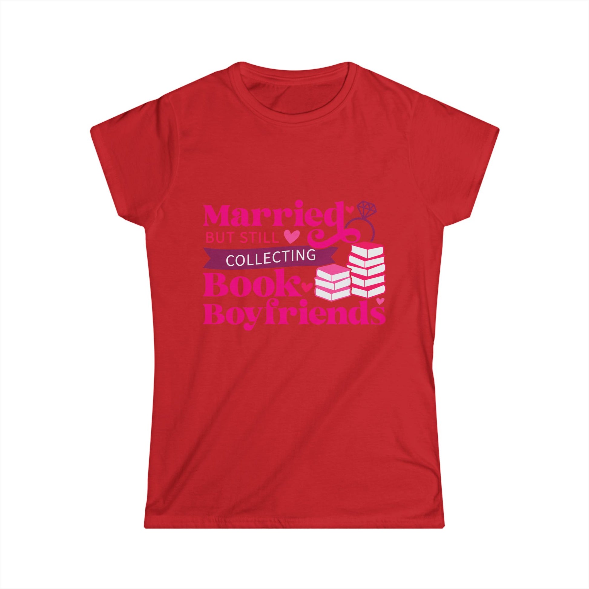Introducing this playful Women's Softstyle Tee, perfect for book lovers who also navigate the joys of marriage! With a charming design that reads, 'Married but still collecting Book Boyfriends,' this tee brings a lighthearted vibe that resonates with readers and romantics alike. Ideal for casual outings, book clubs, or cozy nights in with a good read, it effortlessly blends comfort with personality. It makes a thoughtful gift for birthdays, anniversaries, or simply to surprise your favorite literary enthusiast. Made for adults, this tee will quickly become a wardrobe favorite, bringing smiles and sparking conversations wherever you go!